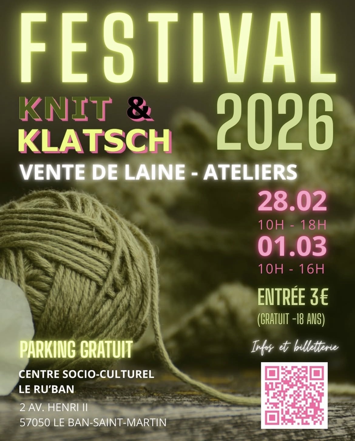 Festival Knit & Klatsch _ Metz _ 28.02 + 1.03Venez faire un petit coucou au stand woolinspires.Ou iscrivez-vous à un cours....Tickets ici